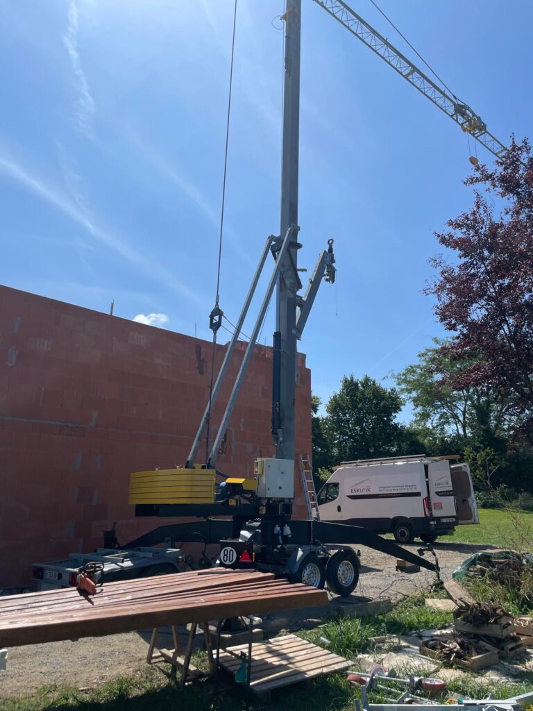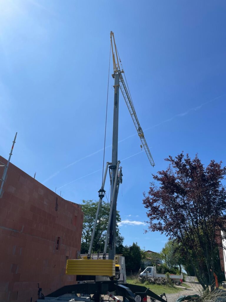 - Grue de chantier : Pour le levage et la mise en place des éléments de charpente et de couverture.